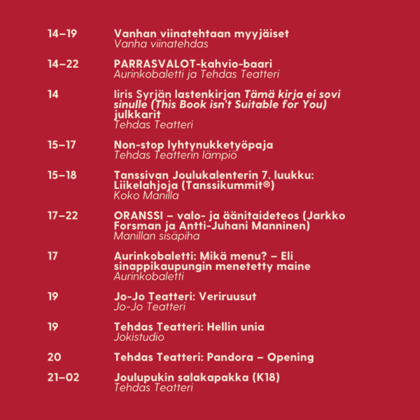 Lauantaina 7.12. klo 14.00–19.00 voit pistäytyä myös Vanhan viinatehtaan joulumyyjäisissä, jossa Manillan väki kokoaa jälleen kattauksen ohjelmaa teatteri- ja tanssiesitysten muodossa sekä runsaasti laadukasta ja yksilöllistä täytettä pukinkonttiin!