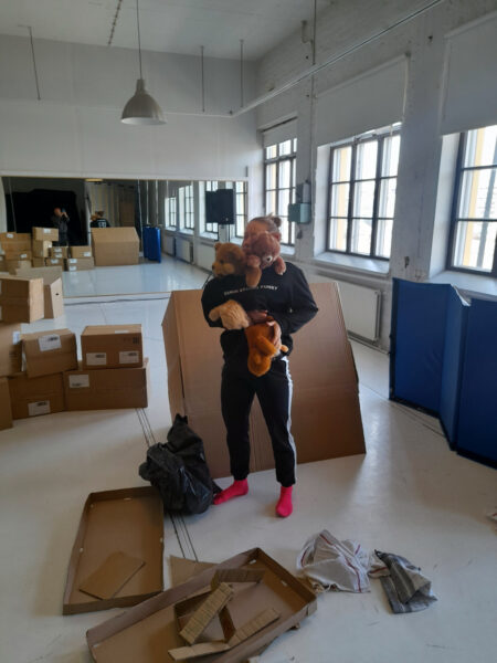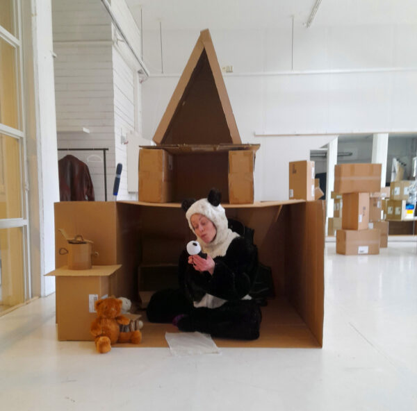 Päätimme siirtyä seuraavaan aihioon, joka oli eläinpuvut. AB:lta löytyi kaksi nallepukua, joilla lähdimme kokeilemaan materiaalin tuottoa. Elina ja Suvi pukeutuivat asuihin, ja jo itsessään pukeutumisen todistaminen oli todella hauskaa. Tanssijat eläinpuvuissa oli todella hellyttävä ja hykerryttävä näky. Päätin, että haluan käyttää pukuja teoksessa, mutta olimme yhtä mieltä siitä, että emme halunneet tehdä pelkkää hauskaa ja komediaa vaan pyrkiä käsittelemään jotakin tärkeää aihetta.